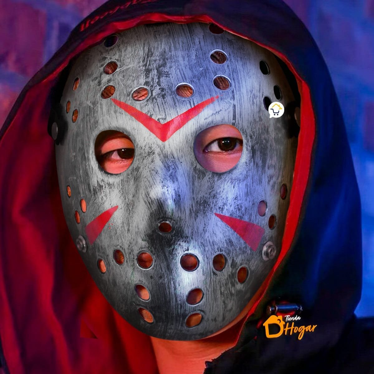 • 🪓 Máscara tipo hockey metálica con detalles rojos